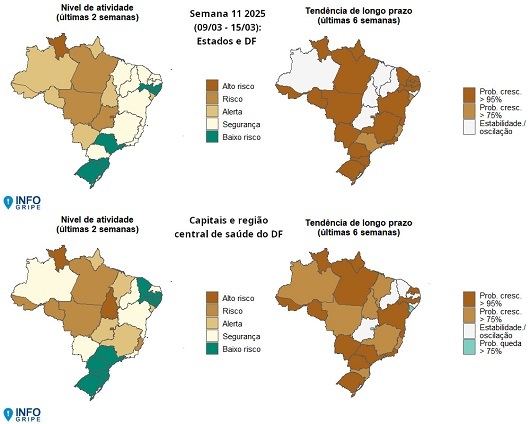 O InfoGripe mostra, ainda, tendência de crescimento de SRAG no longo prazo, até a Semana Epidemiológica (SE) 11, que abrange o período de 9 a 15 de março.